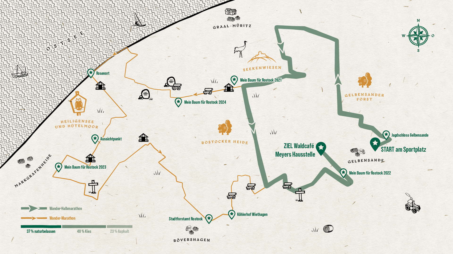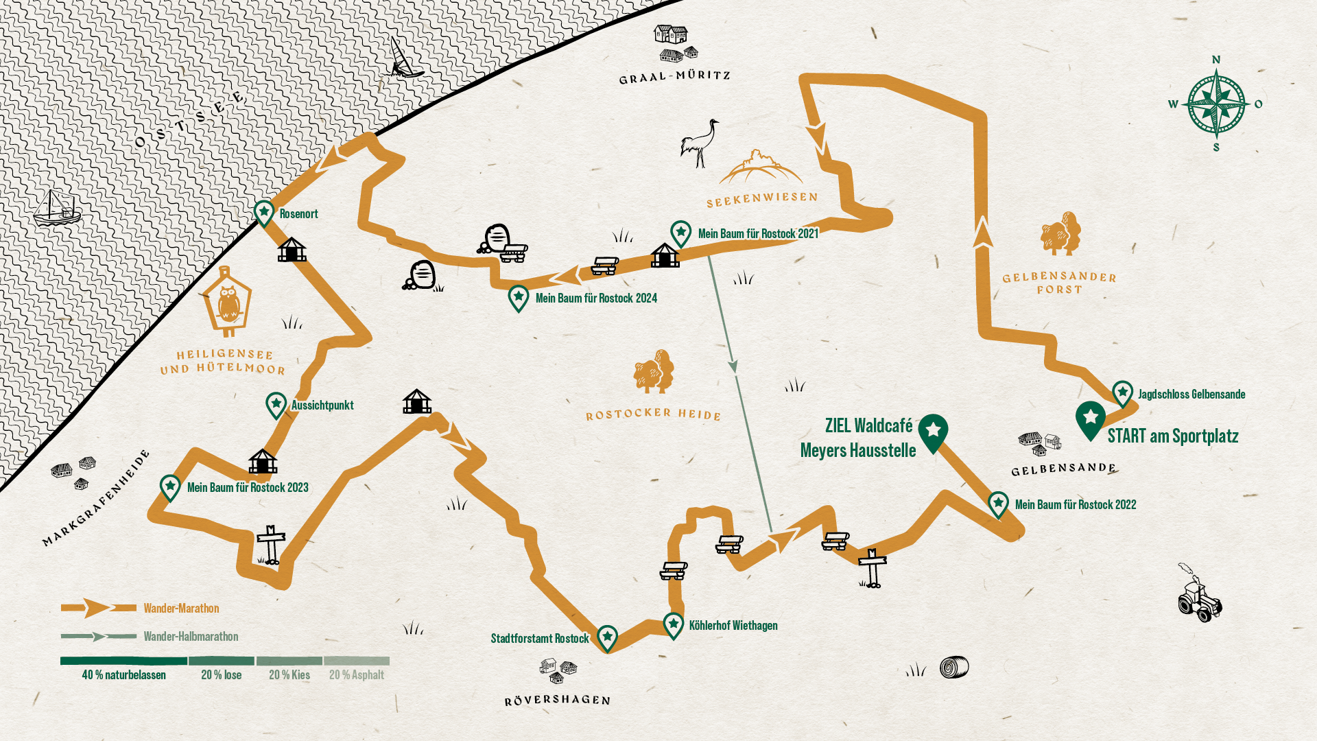 Ja, es ist ein echter Marathon. Die 42,2 km starten am Sportplatz in Gelbensande. Nach wenigen Augenblicken bist du am Jagdschloss Gelbensande. Leider bleibt keine Zeit, sich diesen Ort näher anzuschauen. Es geht munter weiter in Richtung Nordwest. Hier erlebst du die Rostocker Heide, wie sie ursprünglicher kaum sein kann. Noch vor Graal-Müritz bzw. Torfbrücke geht es in südlicher Richtung vorbei an den „Seekenwiesen“. Ein echter Hotspot für die Tierwelt. Bevor du fast 1/3 der Strecke geschafft hast, kommst du an der 1. Pflanzstelle der Aktion „Mein Baum für Rostock“ vorbei. Hier haben 2021 hunderte Freiwillige auf 1,5 Hektar mit uns einen neuen Wald gepflanzt. Der erste offizielle Check-Point ist geschafft. Es ist Zeit für eine kleine Stärkung. Nach einigen Kilometern westwärts richtet sich der Kurs jetzt wieder auf Nordwest. Ziel für diesen Abschnitt ist die Ostseeküste bei Torfbrücke. Am Strand entlang geht es bis nach Rosenort. Wer die Augen offen hält, kann mitunter Badenixen oder Robben entdecken. Der Weg vorbei am Heiligensee und dem Hütelmoor ist sagenumwoben. Du hast leider keine Zeit für einen Ausflug in die Märchenwelt. Bei ca. 2/3 des Weges heißt es jetzt, gut zu Fuß zu sein. Vorbei geht es an weiteren Baumpflanzstellen, einer Pilzfarm und „Brandt’s Kreuz“. Eine Sage berichtet von einem Jäger aus dem 17. Jahrhundert … Leider musst du weiter. Flink geht es über die Landstraße nördlich von Hinrichshagen. Fast fliegen die Kilometer an dir vorbei. Das Forstamt kommt in Sicht, der historische Köhlerhof wird passiert. Kleine Häuser entlang der Strecke sagen dir, jetzt ist es nicht mehr weit. Für den letzten Streckenabschnitt ist Motivation alles. Der Zielort „Meyers Hausstelle“ ist ein uriges Waldrestaurant mit guter Küche. Was für eine tolle Aussicht. Das Ziel rückt immer näher. Die letzten 3 km müssen einfach noch geschafft werden. Und dann steht die Marke bei 42,2 km. Marathon geschafft. Du bist ein Heide Hiking Champion.